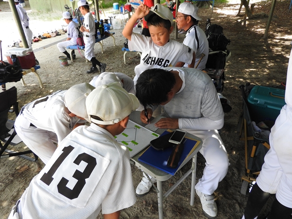 4回の表、苦しい場面ではタイムをとって、いったん緊張ムードをほぐしたのかな?